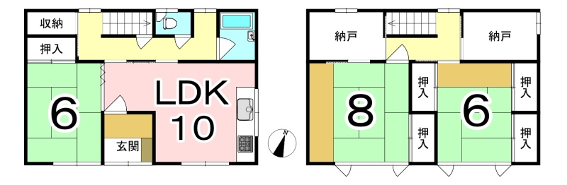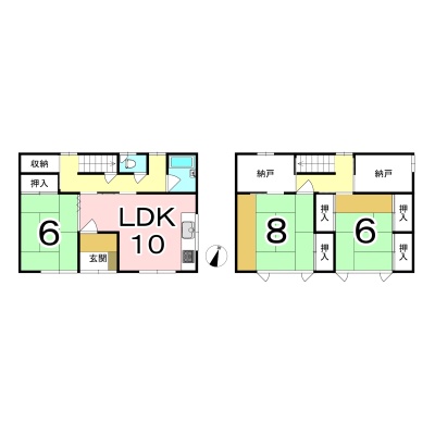 | 間取り | 3SLDK1階:LDK10帖 和室6帖 / 2階:和室8帖 和室6帖 S3帖 S3帖 |