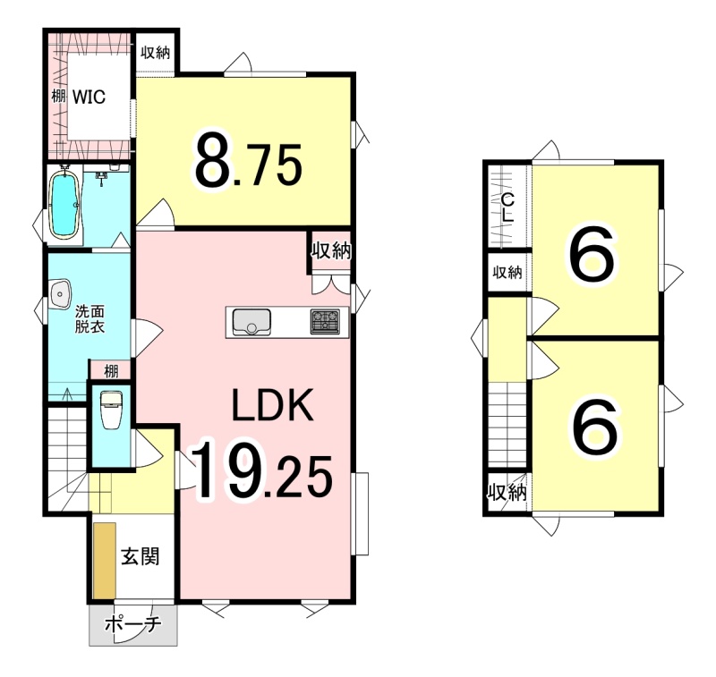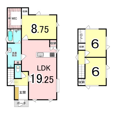 | 間取り | 3LDK1階:LDK19.25帖 / 2階:洋室8.75帖 洋室6帖 洋室6帖 |
