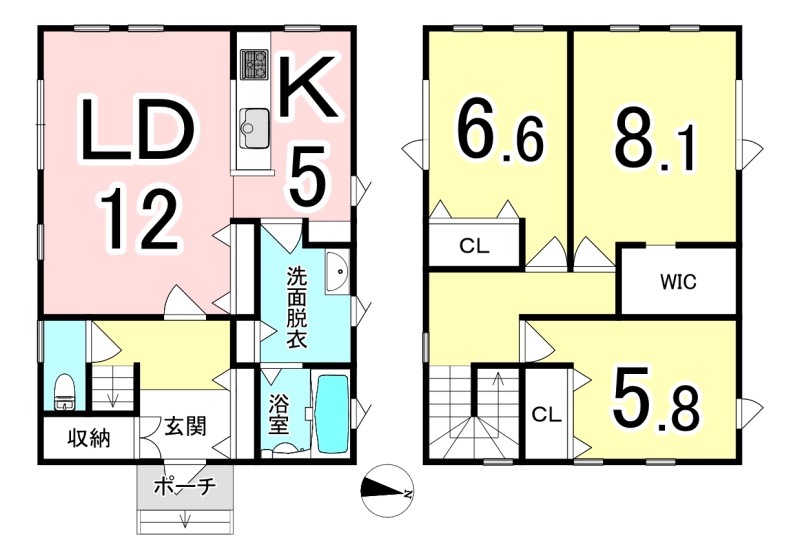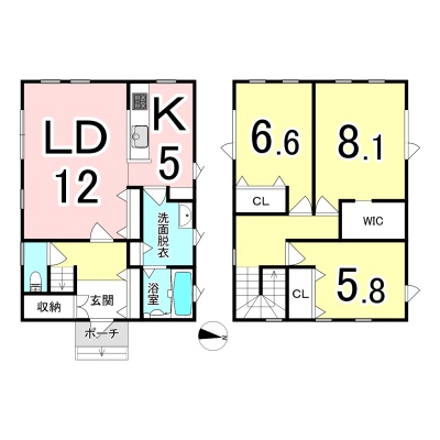 | 間取り | 3LDK1階:LD12帖 K5帖 / 2階:洋室5.8帖 洋室6.6帖 洋室8.1帖 |