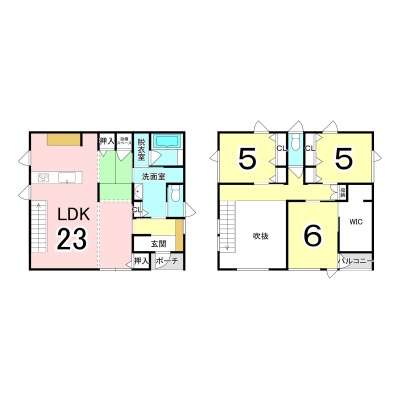 | 間取り | 3LDK1階:LDK23帖 / 2階:洋室5帖 洋室5帖 洋室6帖 |