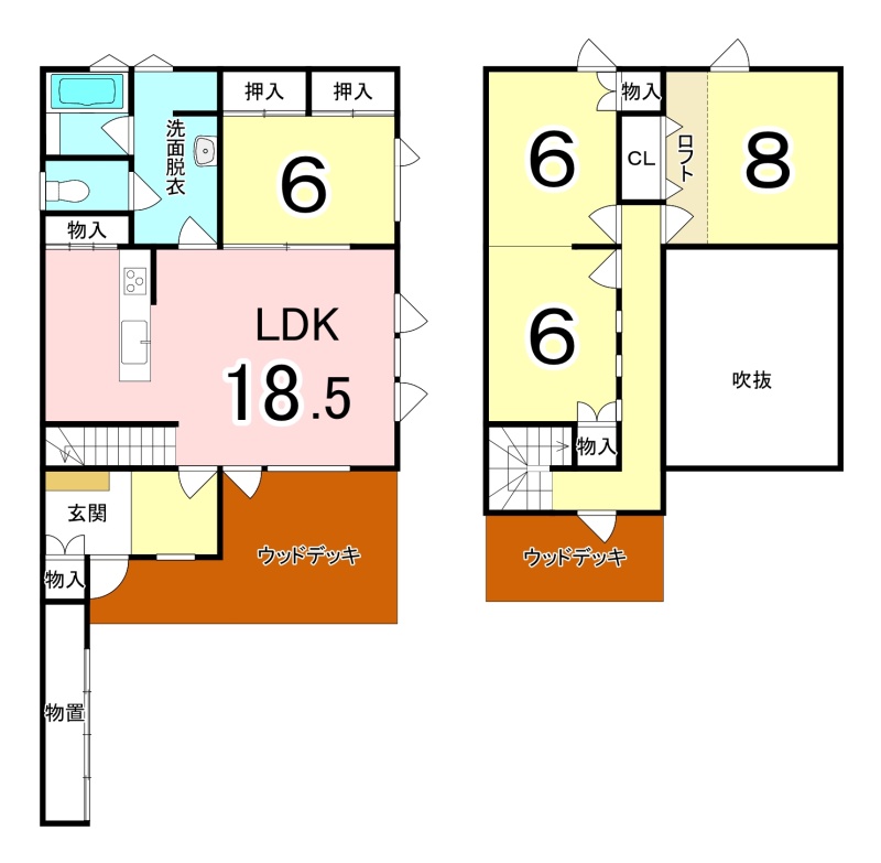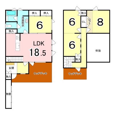 | 間取り | 4LDK1階:LDK18.5帖 洋室6帖 / 2階:洋室8帖 洋室6帖 洋室6帖 |