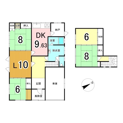 | 間取り | 4SLDK1階:L10帖 DK9.6帖 和室8帖 和室6帖 S2帖 / 2階:和室8帖 洋室6帖 |