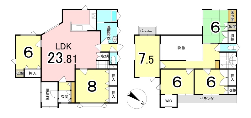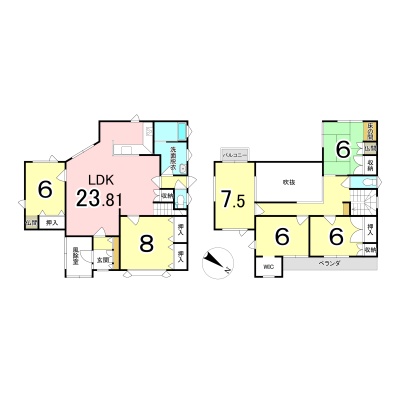 | 間取り | 6LDK1階:LDK23.8帖 洋室8帖 洋室6帖 / 2階:和室6帖 洋室7.5帖 洋室6帖 洋室6帖 |