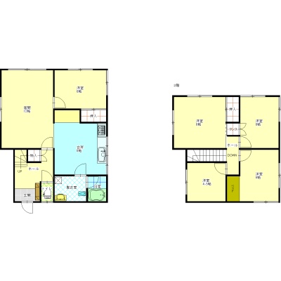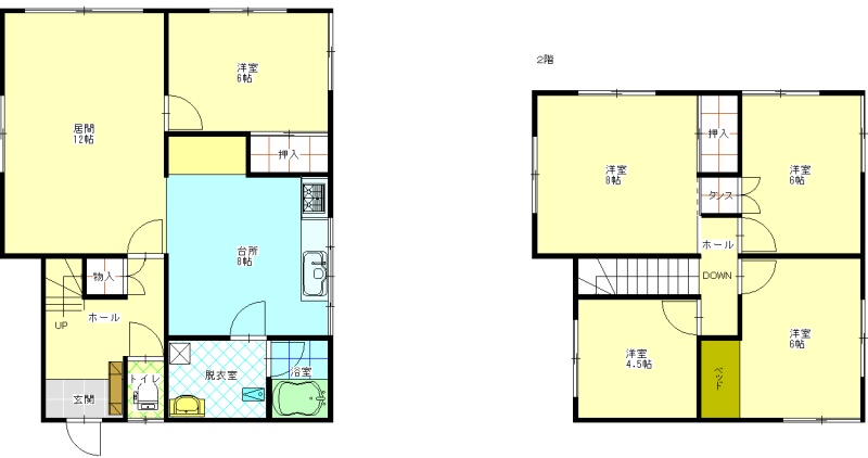 | 間取り | 5LDK1階:LDK12帖 K8帖 洋室6帖 / 2階:洋室4.5帖 洋室6帖 洋室6帖 洋室8帖 |