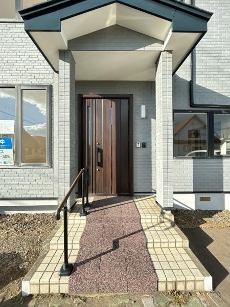 【玄関】玄関ドアは鍵を交換いたしました。玄関前階段に手すりが