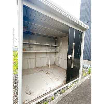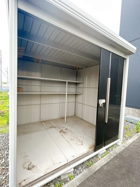 【物置】建物外には鍵付きの物置がございます。奥に棚があるので