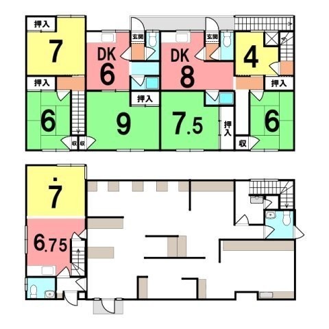 建物の階建 地上2階建 主要採光面 構造 木造 間取り 専有面積 238.4m² (72.11坪) 部屋の間取り 駐車場 あり 駐車場台数:6台接道状況 一方 - 北東側幅22.50mの公道に17.40m接道