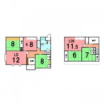 | 間取り | 4SLDKLD12.0帖 K8.0帖 和室8.0帖 和室8.0帖 LDK11.5帖 和室7.0帖 和室6.0帖 S(納屋)3.0帖 |
