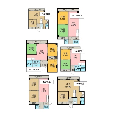 建物の階建 地上3階建 間取り 1LDK×2戸、2DK×4戸、3DK×2戸 駐車場 あり 駐車場台数:10台敷地内2台(ピロティ)、近隣約50mに8台分有り