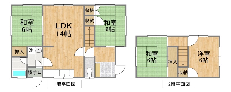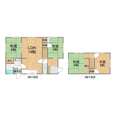 | 間取り | 4LDK1階:LDK14帖 和室6帖 和室6帖 / 2階:和室6帖 洋室6帖 |