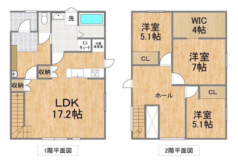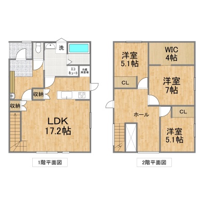| 間取り | 3LDK1階:LDK17.2帖 / 2階:洋室7帖 洋室5.1帖 洋室5.1帖 |