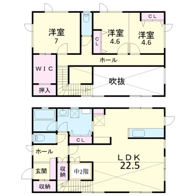 | 間取り | 3LDK1階:LDK22.5帖 / 2階:洋室4.6帖 洋室4.6帖 洋室7帖 |