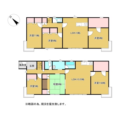 | 間取り | 二世帯型1階:LDK15.25帖 洋室7帖 和室6帖 洋室5帖 / 2階:LDK15帖 洋室8帖 洋室7.5帖 洋室6帖 |