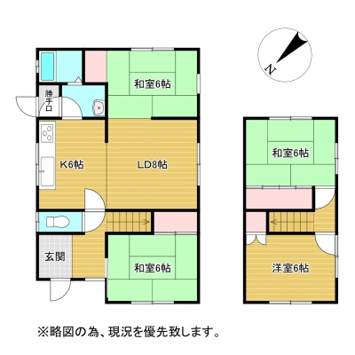 | 間取り | 4LDK1階:LDK14帖 和室6帖 和室6帖 / 2階:和室6帖 洋室6帖 |