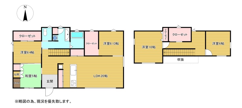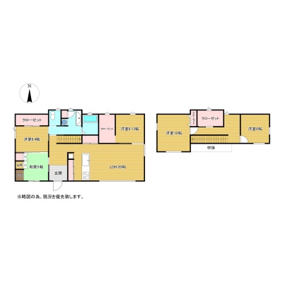 | 間取り | 5LDK1階:LDK20帖 洋室6.13帖 洋室6.4帖 和室5帖 / 2階:洋室10帖 洋室6帖 |