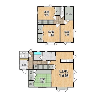 | 間取り | 4SLDK1階:LDK19帖 和室8帖 / 2階:洋室8帖 洋室7帖 洋室6帖 S3帖 |