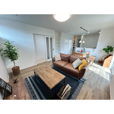 リビングには便利なオープン収納を設置。日用品をおしゃれに飾りながら収納でき、空間をすっきり保てます。
