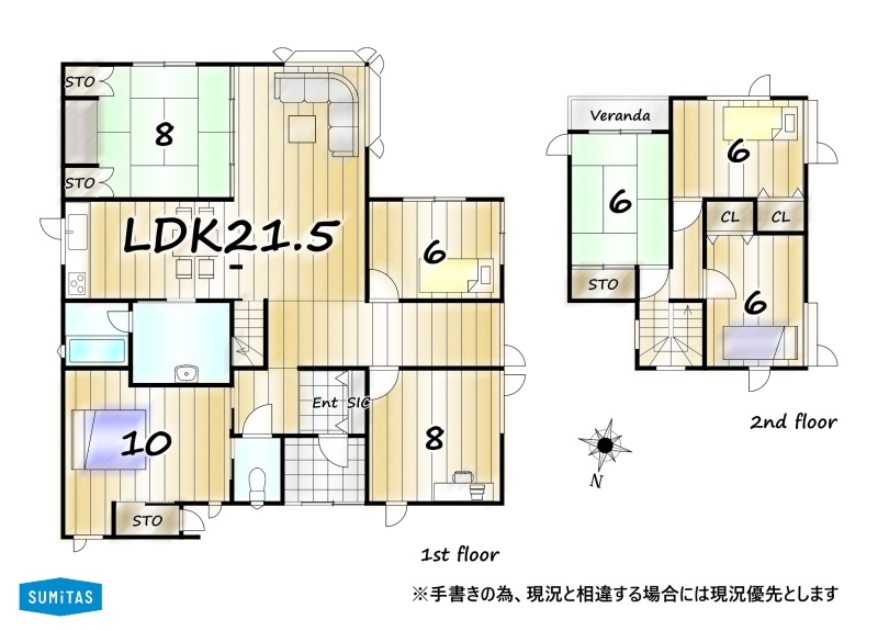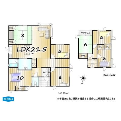 | 間取り | 7DK以上1階:LDK21.5帖 洋室10帖 洋室8帖 洋室6帖 和室8帖 / 2階:洋室6帖 洋室6帖 和室6帖 |
