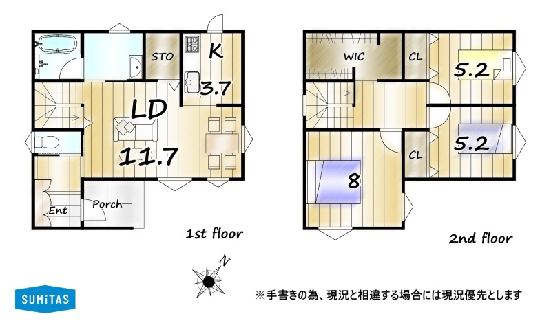 | 間取り | 3LDK1階:LD11.7帖 K3.7帖 / 2階:洋室8帖 洋室5.2帖 洋室5.2帖 |