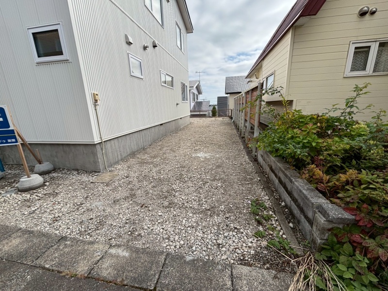 玄関にはエントランスフードが設けられており、雨や雪の日も快適に出入りできます。2台分の駐車スペースも確保されています。