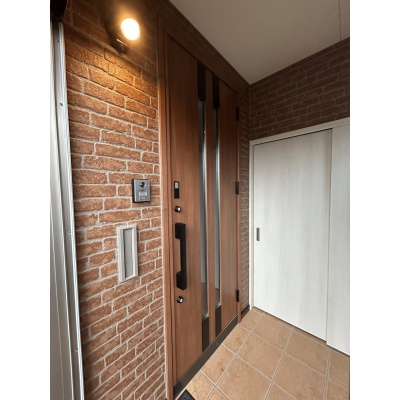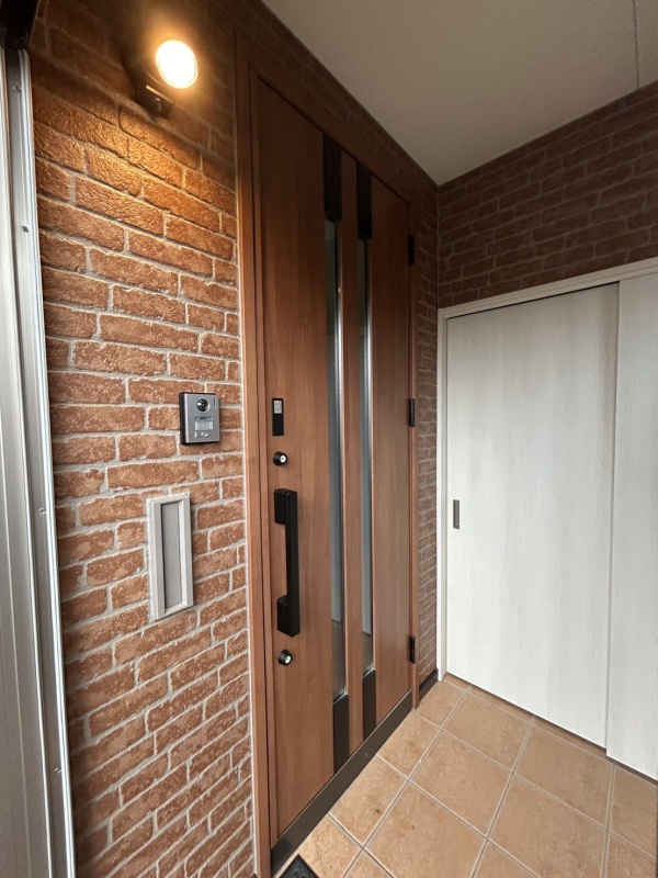 レンガ調の外壁と木目調の玄関ドアが調和した、温かみのあるエントランス。訪れる人をやさしく迎える印象的な外観です。