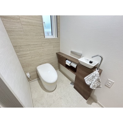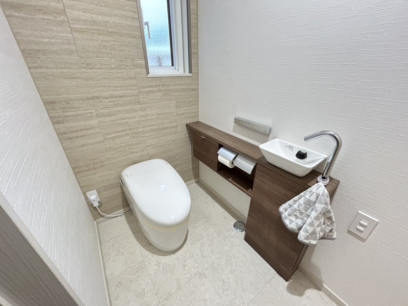 タンクレストイレはすっきりとしたデザインで、手洗い場も併設されており、衛生的で使い勝手の良い空間を実現しています。