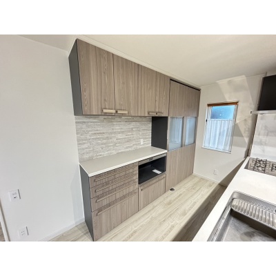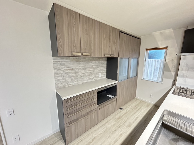 大容量の背面収納があることで、キッチン周りの小物や食器をすっきり整理でき、使い勝手の良い快適な空間を実現しています。