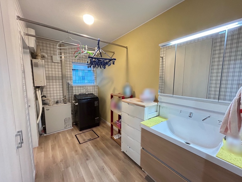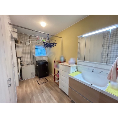 広々とした脱衣所は、洗濯物を干すスペースとしても便利で、家事動線がスムーズになり快適に使える空間です。