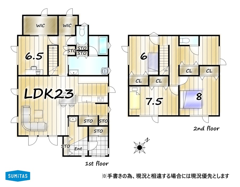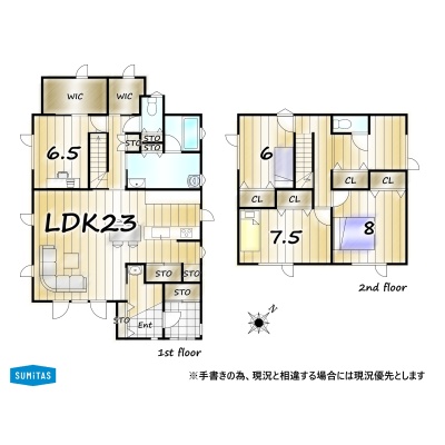 | 間取り | 4LDK1階:LDK23帖 洋室6.5帖 / 2階:洋室8帖 洋室7.5帖 洋室6帖 その他5帖 |