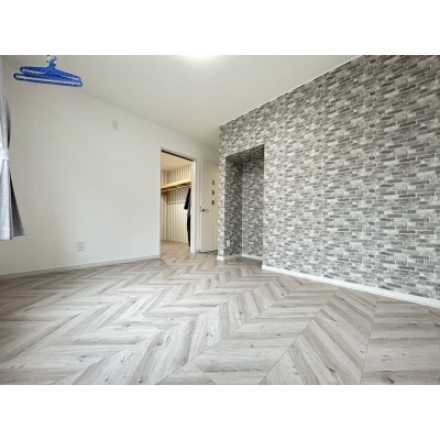 アクセントクロスが映える空間は、部屋全体におしゃれな印象を与え、シンプルなインテリアに華やかさと個性をプラスしています。