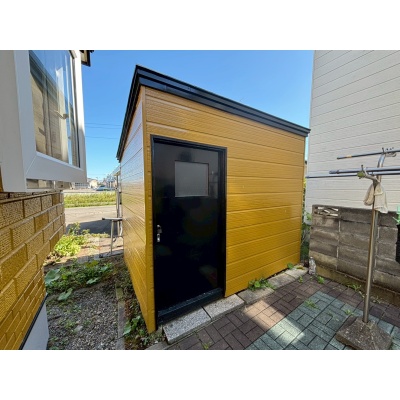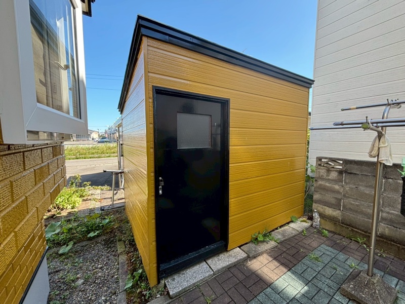 物置も完備されており、季節用品やアウトドアグッズの収納にも便利。整った外観と機能性を兼ね備えた住まいです。
