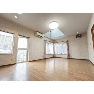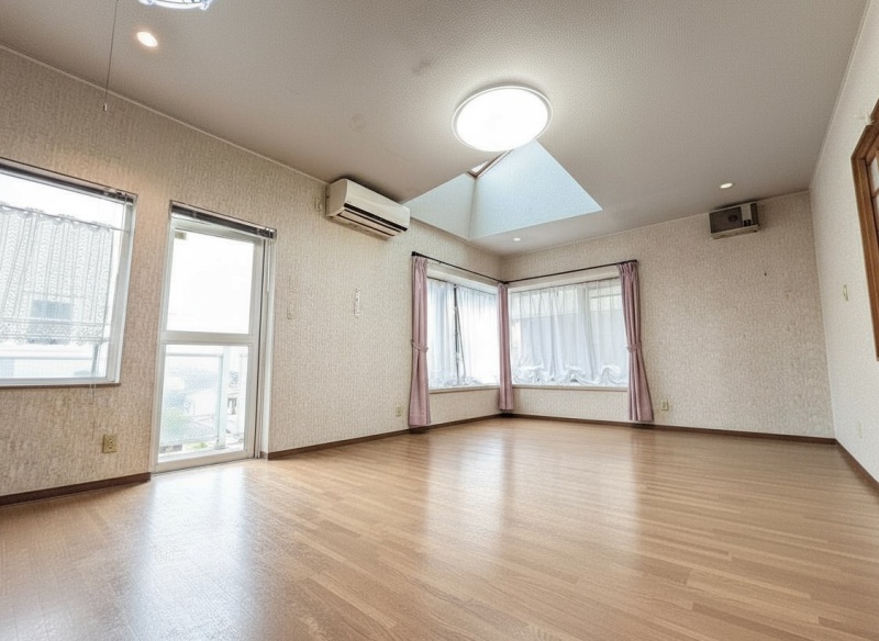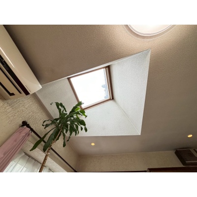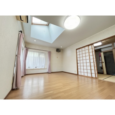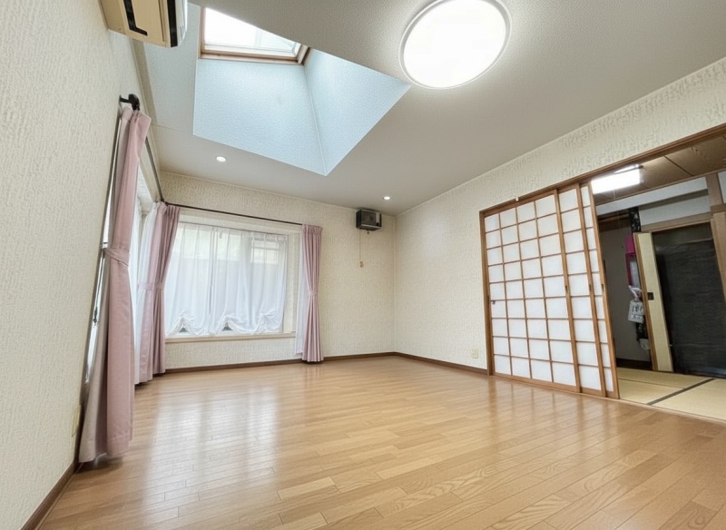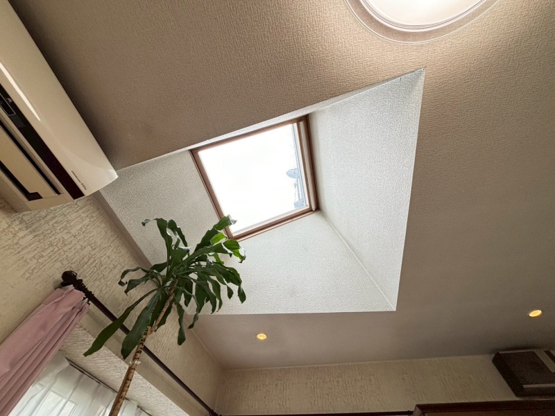 天窓から降り注ぐ自然光が室内を明るく照らし、開放感と心地よさを演出。四季折々の光の移ろいを楽しめる魅力的な空間です。