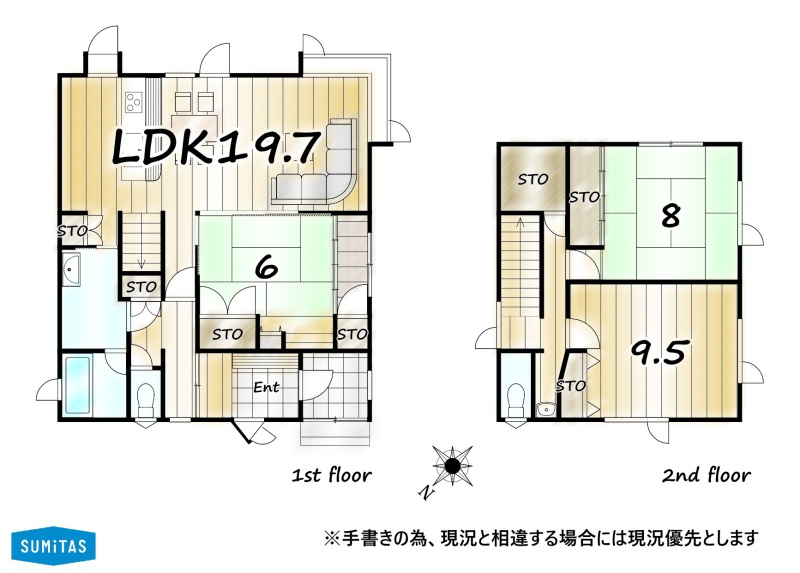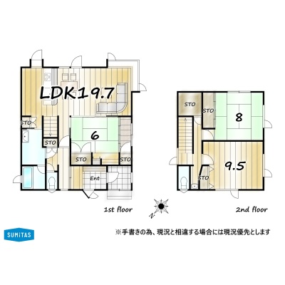 | 間取り | 3LDK1階:LDK19.7帖 和室6帖 / 2階:洋室9.5帖 和室8帖 |