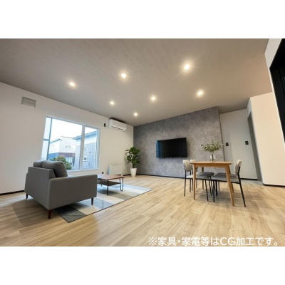 アクセントクロスとダウンライトを取り入れたリビングは、空間におしゃれな表情をプラス。スタイリッシュな雰囲気が魅力です。