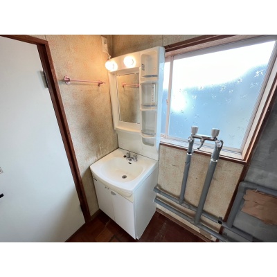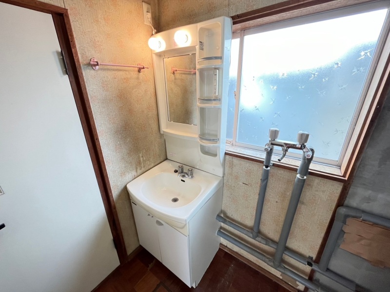 収納付き洗面台で日用品の整理も便利。壁クロス・床材を張り替え、最新の洗面ユニットへ交換。