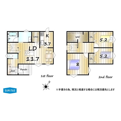 | 間取り | 3LDK1階:LD11.7帖 K3.7帖 / 2階:洋室8帖 洋室5.2帖 洋室5.2帖 |