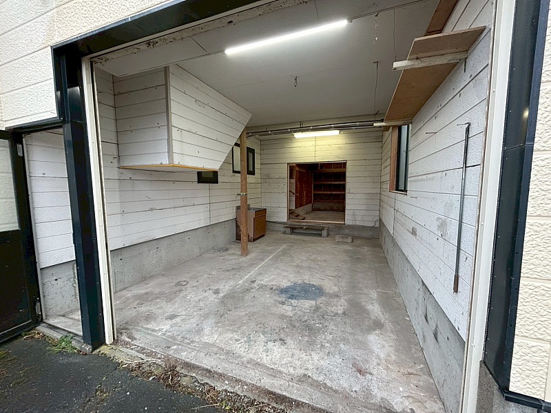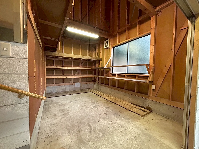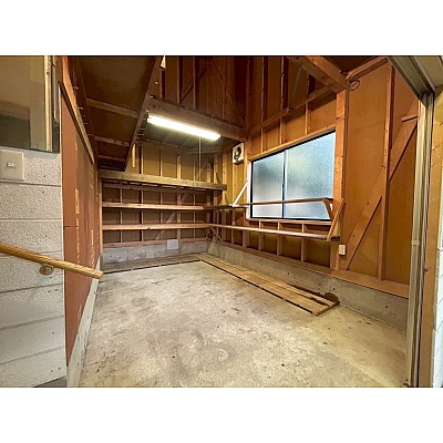 車庫の奥には便利な物置スペースがあります。タイヤや季節用品、工具類の収納に最適で、実用性の高いスペースです。