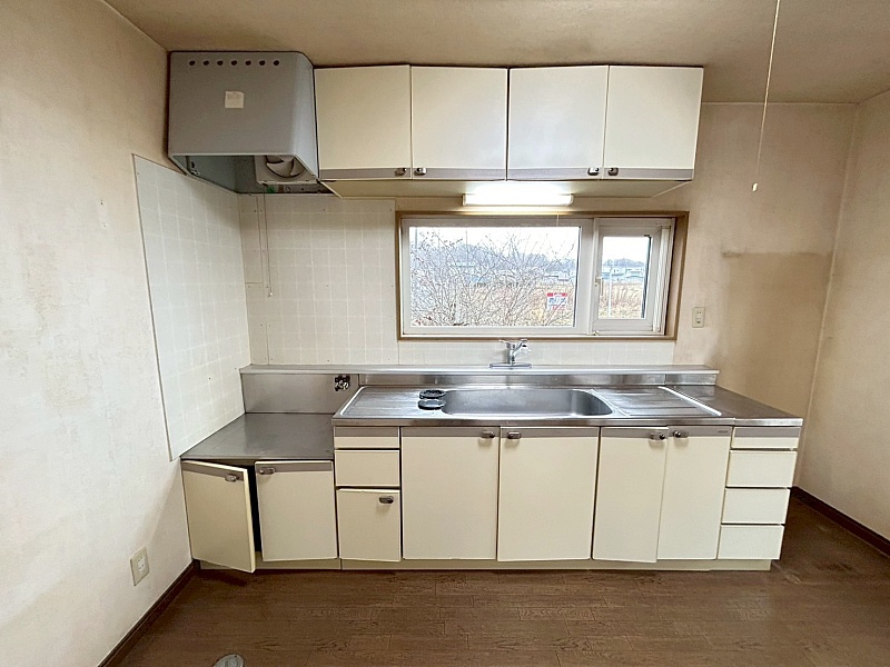吊戸棚付きのキッチンは、収納力があり調理道具もすっきり整理可能。使いやすいレイアウトで、毎日の料理が快適に行えます。