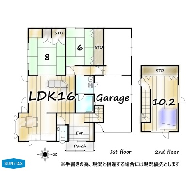 | 間取り | 3LDK1階:LDK16帖 和室8帖 和室6帖 / 2階:洋室10.2帖 |
