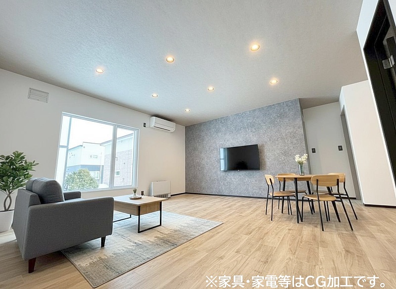 アクセントクロスとダウンライトを取り入れたリビングは、空間におしゃれな表情をプラス。スタイリッシュな雰囲気が魅力です。