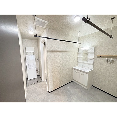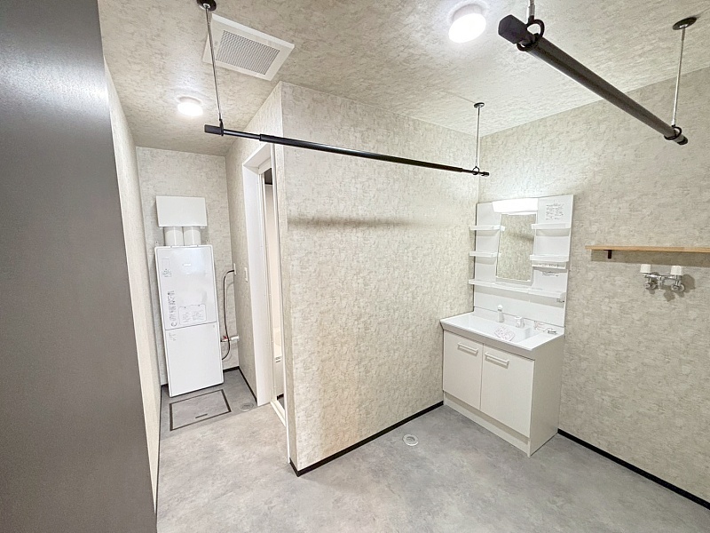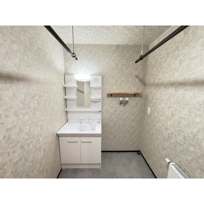 明るく爽やかな洗面所は、清潔感たっぷり。収納が充実しているため使いやすく、物干しバー付きで室内干しにも便利です。