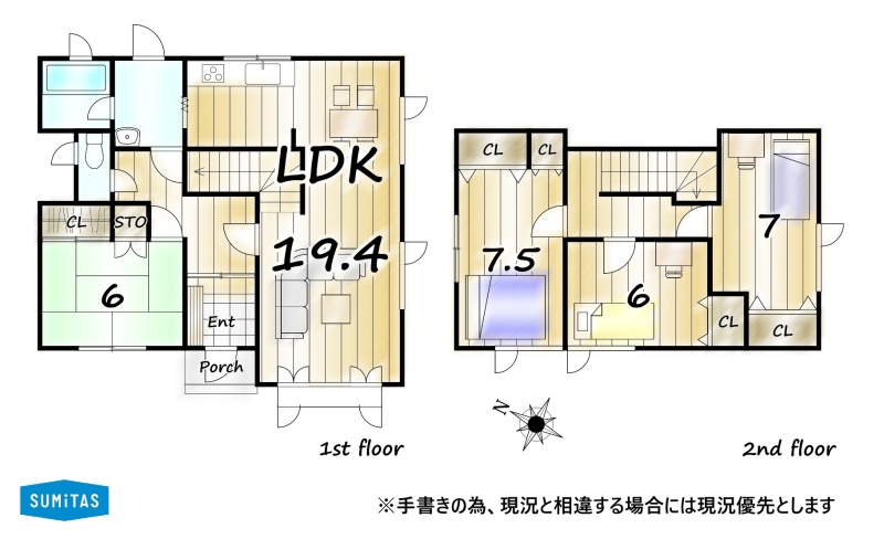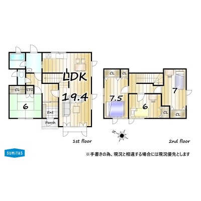 | 間取り | 4LDK1階:LDK19.4帖 和室6帖 / 2階:洋室7.5帖 洋室7帖 洋室6帖 |