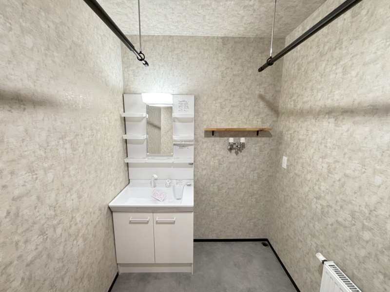 明るく爽やかな洗面所は、清潔感たっぷり。収納が充実しているため使いやすく、物干しバー付きで室内干しにも便利です。
