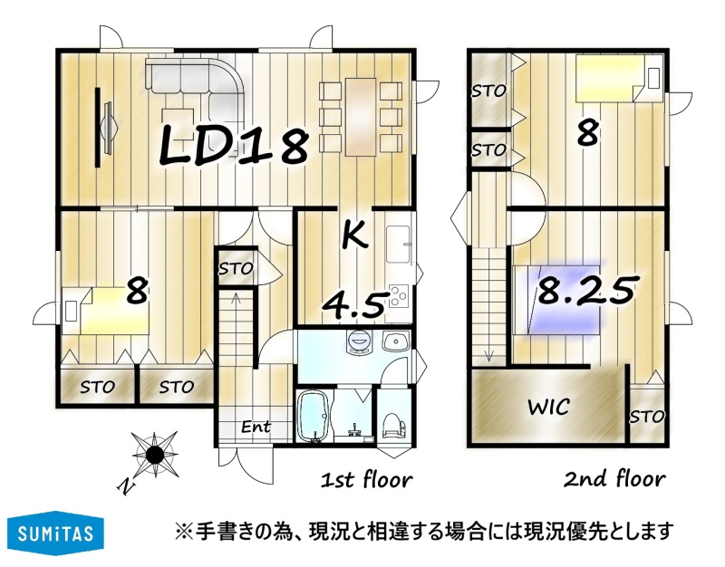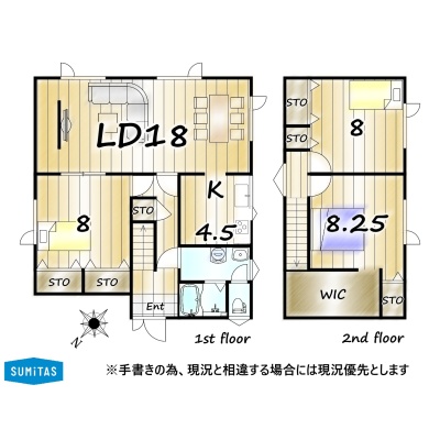 | 間取り | 3LDK1階:LD18帖 K4.5帖 洋室8帖 / 2階:洋室8.2帖 洋室8帖 |