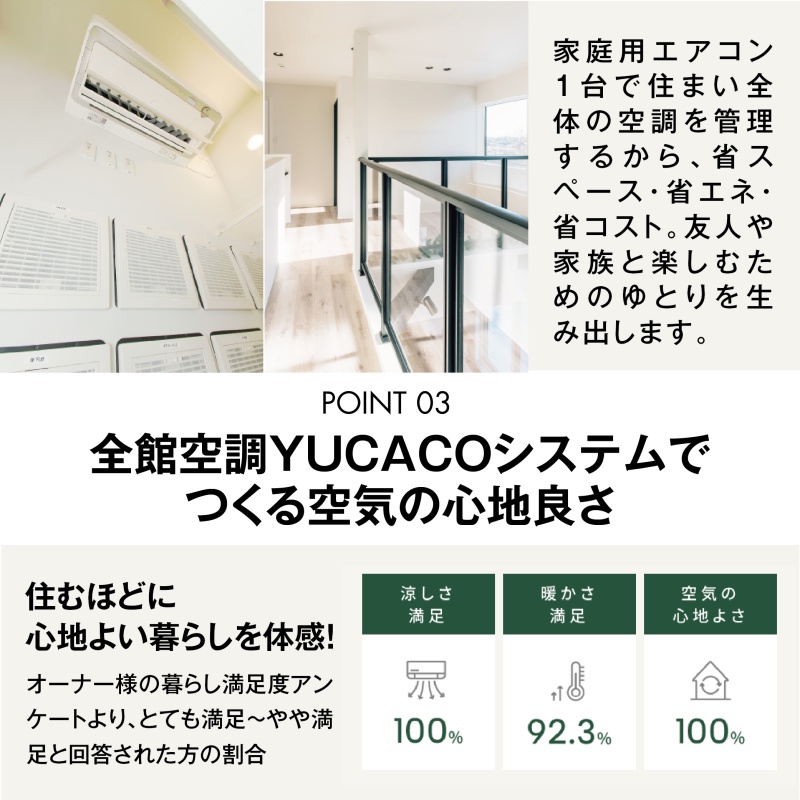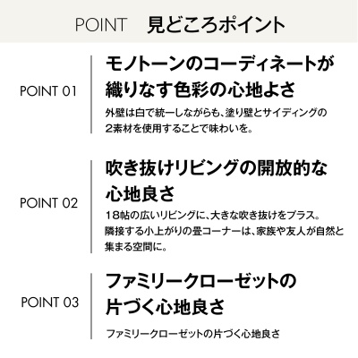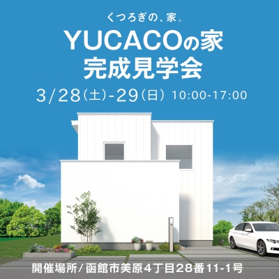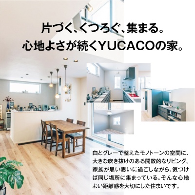ここに注目!空気も、空間も、心地よく。 人が自然と集まる、吹き抜けの住まい。 片づく、くつろぐ、集まる。 心地よさが続くYUCACOの家。 3月28日(土)・29日(日)に函館市美原にて、 くつろぎの時間が自然と生まれるYUCACOの家を公開します。 白とグレーで整えたモノトーンの空間に、 大きな吹き抜けのある開放的なリビング。 家族が思い思いに過ごしながら、 気づけば同じ場所に集まっている。 そんな心地よい距離感を大切にした住まいです。 ファミリークローゼットを中心にした回遊動線や、 全館空調YUCACOシステムがつくる快適な空気環境など、 毎日の暮らしをやさしく支える工夫も随所に。 家族との時間も、友人との時間も、 ゆったりと楽しめる「くつろぎの、家。」を、ぜひ現地でご体感ください。