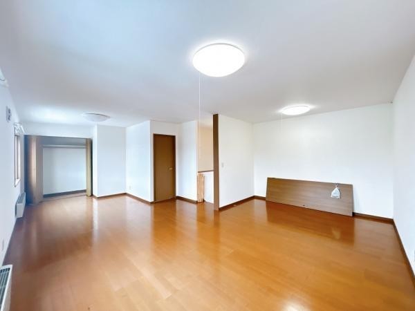 【現況】別アングルから撮影した約19.5帖のLDKです。南側