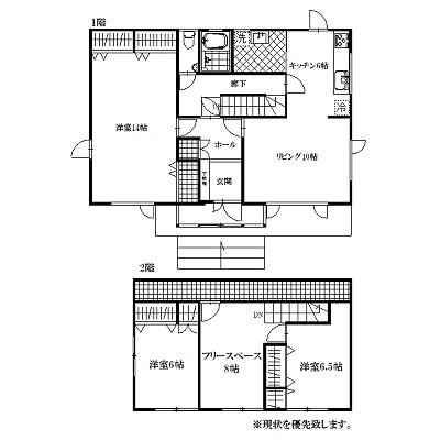 | 間取り | 3SLDK1階:LDK16帖 洋室14帖 / 2階:洋室6帖 洋室6.5帖 その他8帖 |
