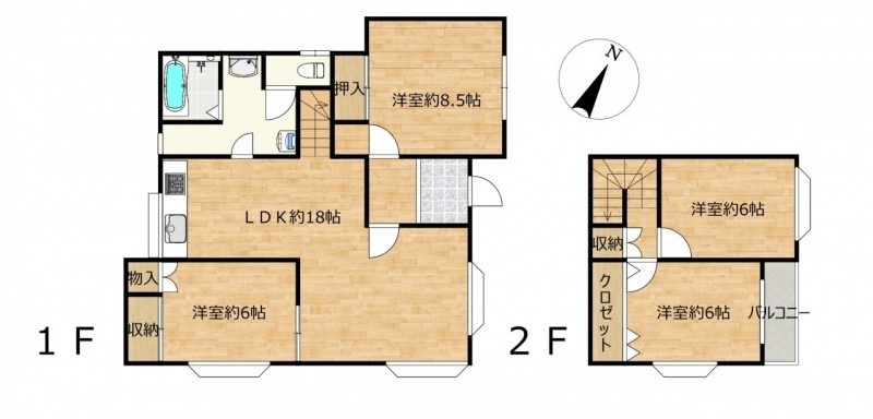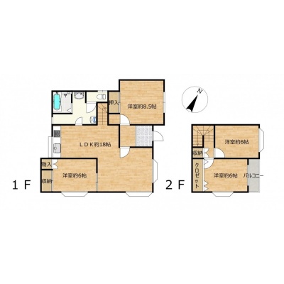 | 間取り | 4LDK1階:LDK18帖 洋室8.5帖 洋室6帖 / 2階:洋室6帖 洋室6帖 |