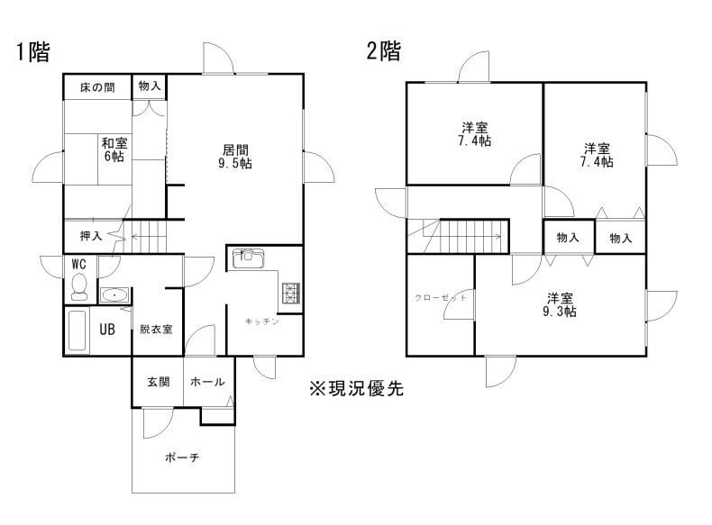 | 間取り | 4LDK1階:LD9.5帖 洋室6帖 / 2階:洋室7.4帖 洋室7.4帖 洋室9.3帖 |