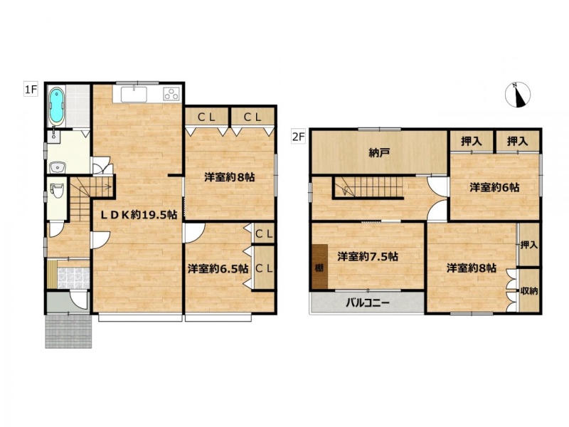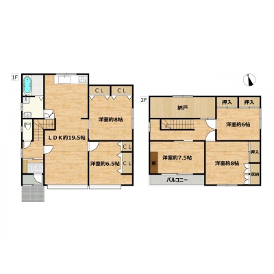 | 間取り | 5LDK1階:LDK19.5帖 洋室8帖 洋室6.5帖 / 2階:洋室8帖 洋室7.5帖 洋室6帖 |